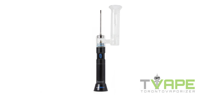 Der Boost ist so konzipiert, dass er ausschließlich mit Konzentraten verwendet werden kann, genau wie herkömmliche Konzentrat-Rigs. Die Einheit wird mit mehreren Nägeln geliefert, darunter eine aus Titan, eine aus Keramik und eine aus Quarz. Diese Nägel werden an der Oberseite des Sockels festgeschraubt und durch einen Keramikstift mit dem Heizelement verbunden. Der Nagel erhitzt sich in etwa 30 Sekunden, und alles, was man braucht, um die Kraft zu aktivieren, ist 3 Klicks der einzigen Taste, wenn Sie den Titan Nagel und 5 Klicks für den Keramik Nagel verwenden.